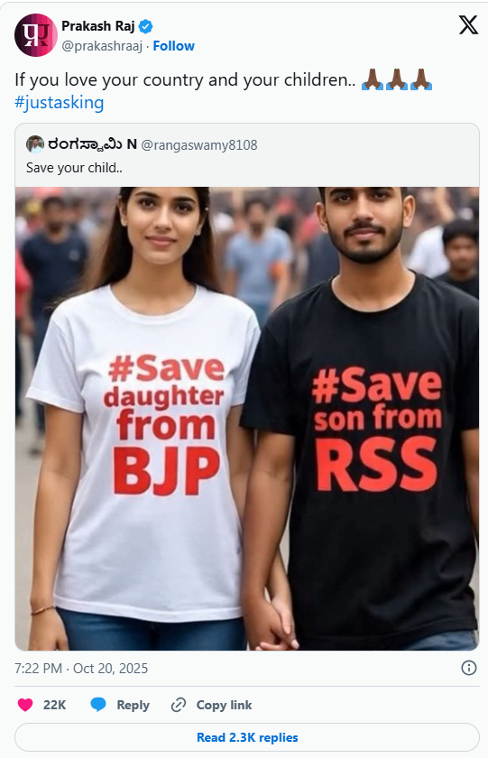 اداکار نے سماجی رابطے کی ویب سائٹ ایکس (سابقہ ٹوئٹر) پر مصنوعی ذہانت سے تیار کردہ ایک تصویر شیئر کی، جس میں ایک لڑکا اور لڑکی دکھائے گئے ہیں، ان کی ٹی شرٹس پر جملے درج تھے: “بیٹے کو آر ایس ایس سے بچائیں، بیٹی کو بی جے پی سے بچائیں۔”